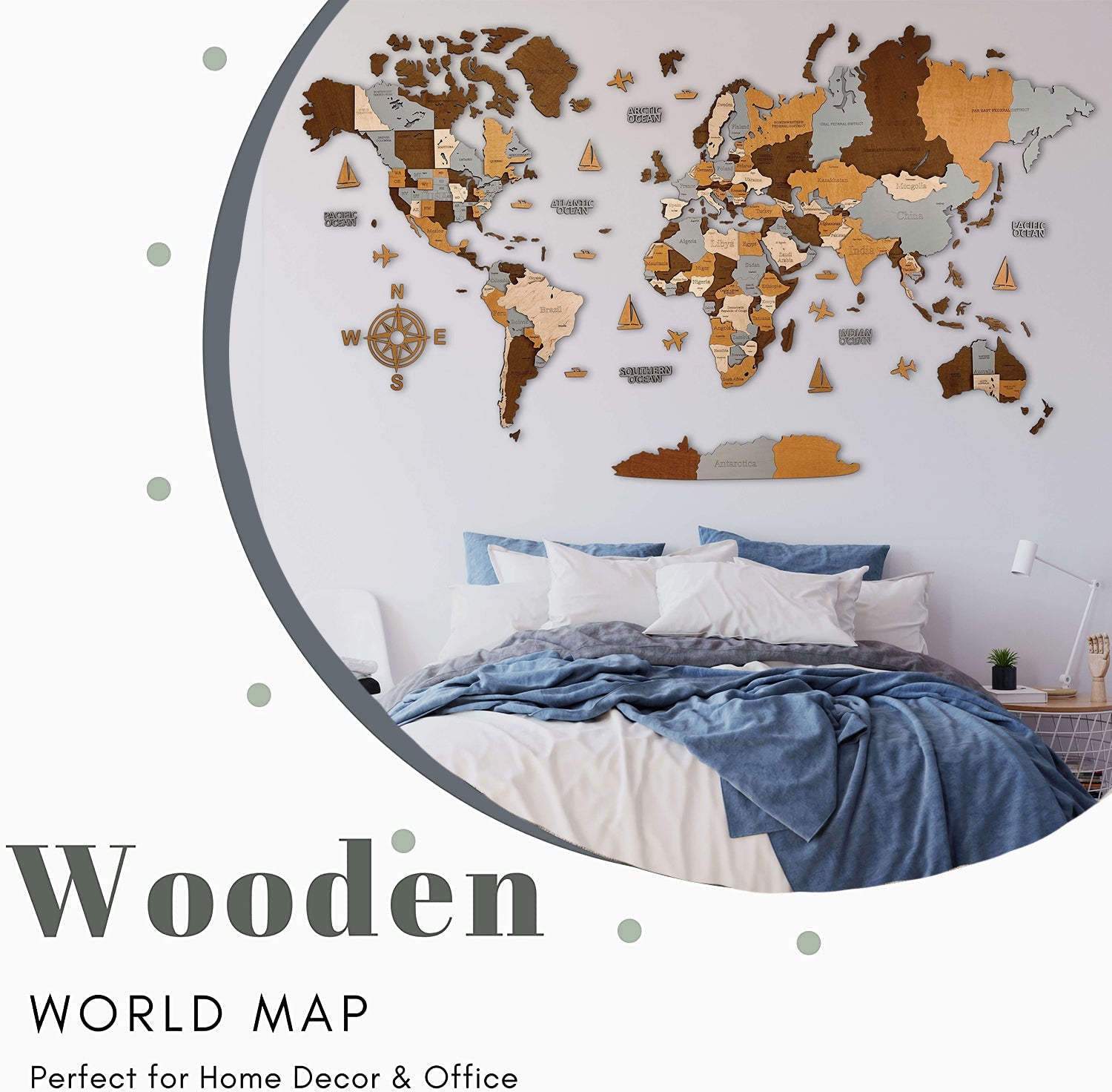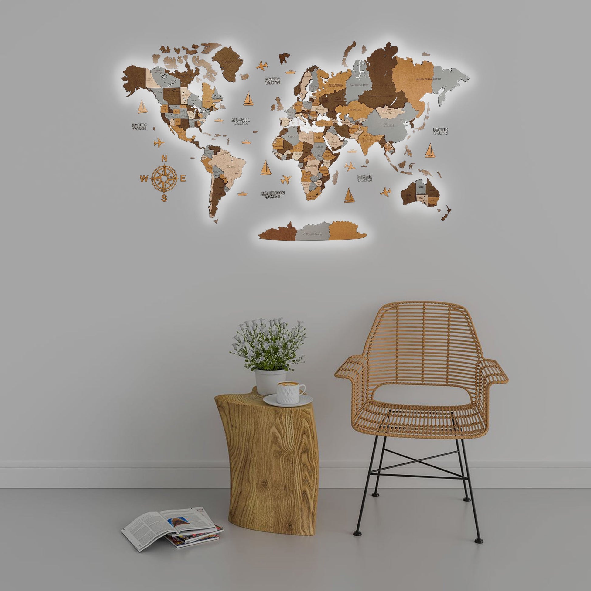 Notre carte du monde en bois est faite avec une grande attention à chaque détail. Nous n'utilisons que des matériaux naturels, tels que le contreplaqué de bouleau et les peintures écologiques. Si vous avez des murs libres, cette carte est la meilleure chose à faire. Le ruban lumineux LED est collé autour des principaux continents. Nous ajoutons une télécommande pour sélectionner les modes et la luminosité du rétroéclairage. Vous pouvez choisir la taille, le type, la couleur du rétroéclairage (lumière chaude ou froide) et le mode de connexion (depuis la prise, depuis le fil derrière la carte ou connexion individuelle).